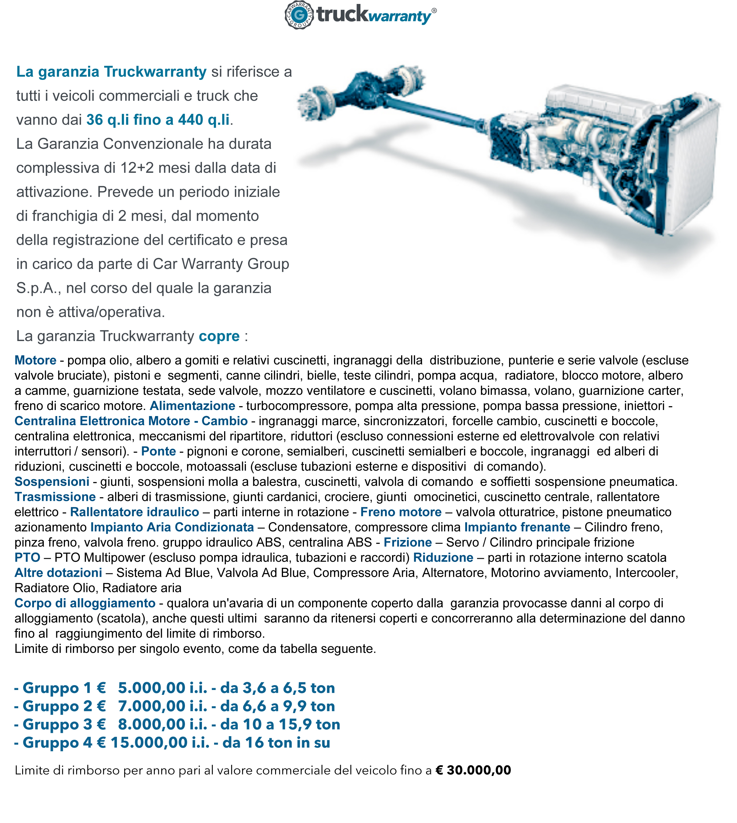 Per veicoli commerciali fino a 50 Qli:- - Con percorrenza fino a km. 200.000 ed età compresa tra 25 e 72 mesi dalla data di Iª imm. € 3.500,00 IVATO (manodopera/ricambi inc.)